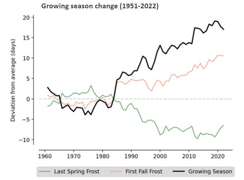 Deviations in average dates of last Spring frost, first Fall frost, and growing season. Figure source: The First Virginia Climate Assessment; Data source: NOAA nClimGrid-daily